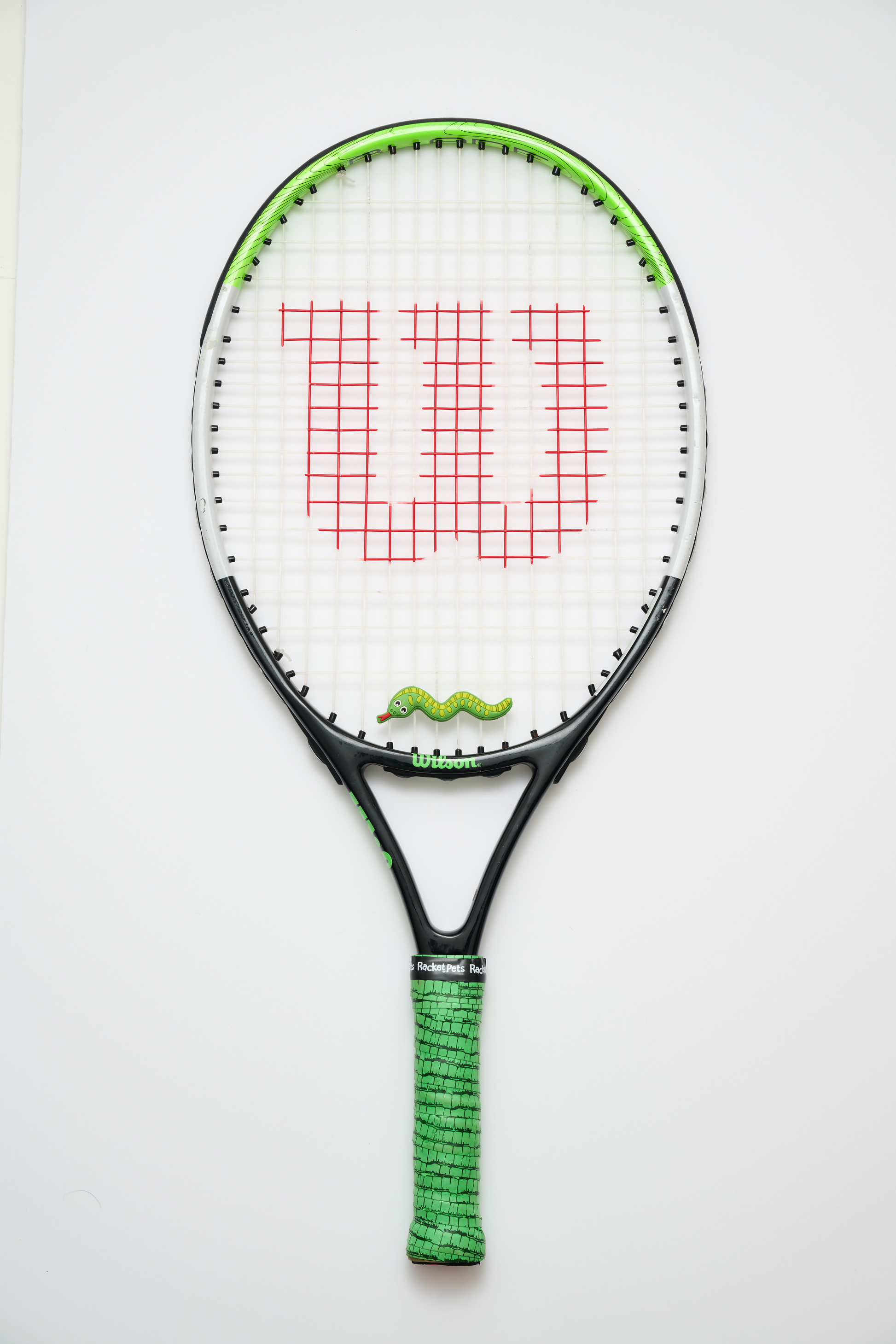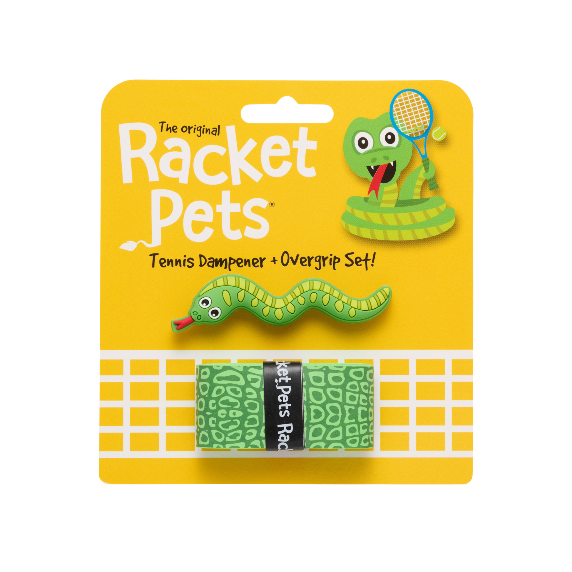 A unique tennis racket overgrip and dampener! In this green snake themed set, the green and yellow grip tape is designed to look like the snake's body. In addition, the set includes a matching snake dampener shock absorber in green and yellow.